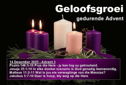 WhatsApp Groepe & Facebook skakels Volgens POPIA wetgewing, moet almal self aansluit by ons sosiale… Read more Eredienstye oor die Kersseisoen Kerkkantoor Advent Koekverkoping, 19 Desember Ons lees hierdie week saam… Baie geluk aan almal wat verjaar! 7/7